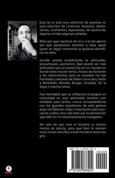 Esta no es solo una colección de poemas, es una colección de cicatrices, ilusiones, desilusiones, momentos, esperanzas, de ausencias; algunas vividas algunas soñadas. Míos por que nacieron de mí y a la vez ajenos por que pertenecen también a todo aquel quien en algún momento se pudiese identificar en ellos. Escribir poesía actualmente es anticuado, presuntuoso, quimérico. Qué puede ser más anticuado que un poeta hoy en un mundo en donde todo está en venta, incluso las ilusiones y los sentimientos; pero la necedad me fue heredada y después de haber conocido y leído a Benedetti, Neruda, Borges, Griselda, De la Vega y muchos otros. Fue inevitable que su influencia empujara mi curiosidad en este admirable sendero casi olvidado para tantos, nunca comparándome con los grandes arquitectos de este género pues me faltarían vidas e inspiración para acercarme a ellos, sino más bien por la admiración que ellos en mi voluntariamente sosegaron. No solo de pan vive el hombre ni mucho menos de poesía, pero que bien le sientan unos versos sencillos a este mundo a veces tan gris.