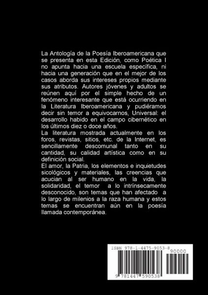 La Antología de la Poesía Iberoamericana que se presenta en esta Edición, como Poética I no apunta hacia una escuela específica, ni hacia una generación que en el mejor de los casos aborda sus intereses propios mediante sus atributos. Autores jóvenes y adultos se reúnen aquí por el simple hecho de un fenómeno interesante que está ocurriendo en la Literatura Iberoamericana y pudiéramos decir sin temor a equivocarnos, Universal: el desarrollo habido en el campo cibernético en los últimos diez o doce años. La literatura mostrada actualmente en los foros, revistas, sitios, etc. de la Internet, es sencillamente descomunal tanto en su cantidad, su calidad artística como en su definición social. El amor, la Patria, los elementos e inquietudes sicológicos y materiales, las creencias que acucian al ser humano en la vida, la solidaridad, el temor a lo intrínsecamente desconocido, son temas que han afectado a lo largo de milenios a la raza humana y estos temas se encuentran aún en la poesía llamada contemporánea.
