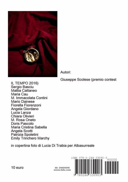 Autori: Giuseppe Scolese (premio contest IL TEMPO 2016) Sergio Basciu, Mattia Cattaneo, Maria Cau, M. Immacolata Contini, Mario Dainese, Fiorella Fiorenzoni, Angela Giordano, Lucia Lanza, Chiara Olivieri, M. Rosa Oneto, Doris Pascolo, Maria Cristina Sabella, Angela Scotti, Patrizia Spoletini Emily Trinchero Marchy foto di copertina di Lucia di Trabia per Albasurreale