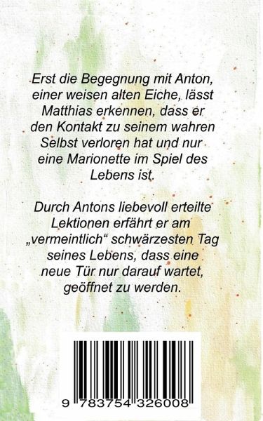 Erst die Begegnung mit Anton, einer weisen alten Eiche, lässt Matthias erkennen, dass er den Kontakt zu seinem wahren Selbst verloren hat und nur eine Marionette im Spiel des Lebens ist.Durch Antons liebevoll erteilte Lektionen erfährt er am "vermeintlich" schwärzesten Tag seines Lebens, dass eine neue Tür nur darauf wartet, geöffnet zu werden.