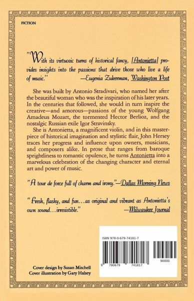 A saga of a magnificent violin, Antonietta, named after a beautiful woman who was the inspiration of Antonio Stradivari's later years. In a masterpiece of historical imagination, Hersey traces the instrument's progress and influence upon owners, musicians, and composers alike--giving us a marvelous celebration of the changing character and eternal art and power of music.
