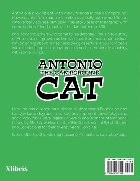 Antonio is a loving cat with many friends in the campground. However, his life is made miserable by a bully cat named Rocco who verbally abuses him daily. This story tells of friendship with some unlikely friends such as the dumpster rats Milt and Ricky and others who come to his defense. This is also a story of Antonio's self-growth as the wise cat from next door advises him on caring about himself and being assertive. This story deals with a serious topic in today's society and is emotionally touching with some humor.