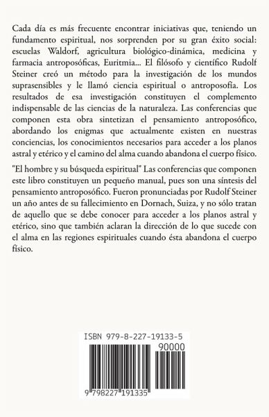 Cada día es más frecuente encontrar iniciativas que, teniendo un fundamento espiritual, nos sorprenden por su gran éxito social: escuelas Waldorf, agricultura biológico-dinámica, medicina y farmacia antroposóficas, Euritmia... El filósofo y científico Rudolf Steiner creó un método para la investigación de los mundos suprasensibles y le llamó ciencia espiritual o antroposofía. Los resultados de esa investigación constituyen el complemento indispensable de las ciencias de la naturaleza. Las conferencias que componen esta obra sintetizan el pensamiento antroposófico, abordando los enigmas que actualmente existen en nuestras conciencias, los conocimientos necesarios para acceder a los planos astral y etérico y el camino del alma cuando abandona el cuerpo físico. "El hombre y su búsqueda espiritual" Las conferencias que componen este libro constituyen un pequeño manual, pues son una síntesis del pensamiento antroposófico. Fueron pronunciadas por Rudolf Steiner un año antes de su fallecimiento en Dornach, Suiza, y no sólo tratan de aquello que se debe conocer para acceder a los planos astral y etérico, sino que también aclaran la dirección de lo que sucede con el alma en las regiones espirituales cuando ésta abandona el cuerpo físico.