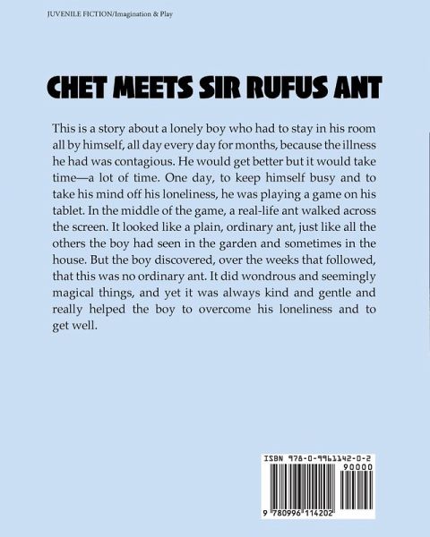 Finalist in the 2021 Feathered Quill Book Awards Program for the Young Readers. This is a story about a lonely boy who had to stay in his room all by himself, all day every day for months, because the illness he had was contagious. He would get better but it would take time-a lot of time. One day, to keep himself busy and to take his mind off his loneliness, he was playing a game on his tablet. In the middle of the game, a real-life ant walked across the screen. It looked like a plain, ordinary ant, just like all the others the boy had seen in the garden and sometimes in the house. But the boy discovered, over the weeks that followed, that this was no ordinary ant. It did wondrous and seemingly magical things, and yet it was always kind and gentle and really helped the boy to overcome his loneliness and to get well.
