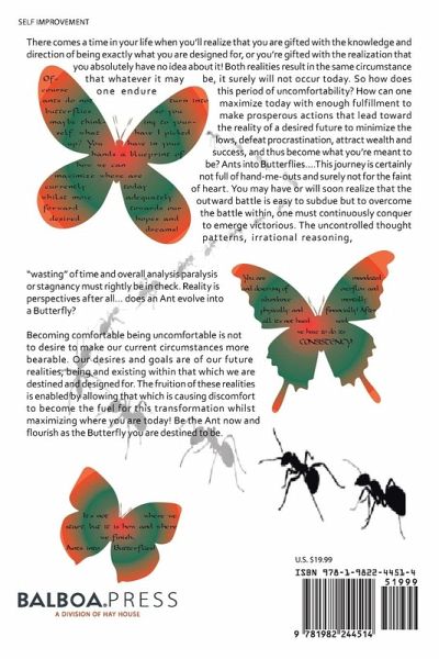 There comes a time in your life when you'll realize that you are gifted with the knowledge and direction of being exactly what you are designed for, or you're gifted with the realization that you absolutely have no idea about it! Both realities result in the same circumstance that whatever it may be, it surely will not occur today. So how does one endure this period of uncomfortability? How can one maximize today with enough fulfillment to make prosperous actions that lead toward the reality of a desired future to minimize the lows, defeat procrastination, attract wealth and success, and thus become what you're meant to be? Ants into Butterflies....This journey is certainly not full of hand-me-outs and surely not for the faint of heart. You may have or will soon realize that the outward battle is easy to subdue but to overcome the battle within, one must continuously conquer to emerge victorious. The uncontrolled thought patterns, irrational reasoning, "wasting" of time and overall analysis paralysis or stagnancy must rightly be in check. Reality is perspectives after all... does an Ant evolve into a Butterfly? Becoming comfortable being uncomfortable is not to desire to make our current circumstances more bearable. Our desires and goals are of our future realities; being and existing within that which we are destined and designed for. The fruition of these realities is enabled by allowing that which is causing discomfort to become the fuel for this transformation whilst maximizing where you are today! Be the Ant now and flourish as the Butterfly you are destined to be.