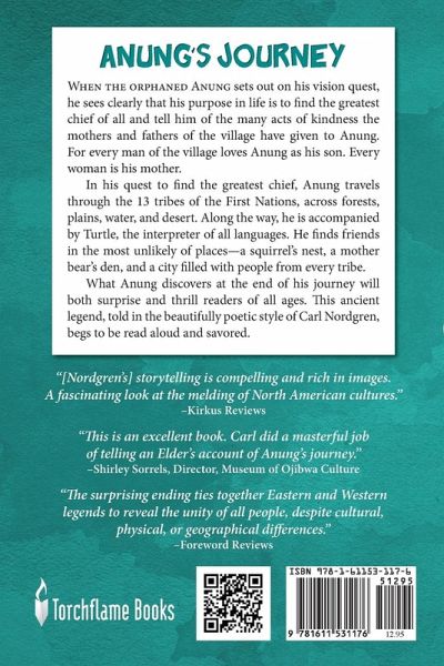 When the orphaned Anung sets out on his vision quest, he sees clearly that his purpose in life is to find the greatest chief of all and tell him of the many acts of kindness the mothers and fathers of the village have given to Anung. When the people of his village learn of the vision, they are proud of him. For every man of the village loves Anung as his son. Every woman is his mother. They believe Gitche Manitou, the great creator, has chosen their son for a special journey.In his quest to find the greatest chief, Anung travels through the 13 tribes of the First Nations, across forests, plains, water, and desert. Along the way, he is accompanied by Turtle, the interpreter of all languages. He finds friends in the most unlikely of places-a squirrel's nest, a mother bear's den, and a city filled with people from every tribe. At each stop, Anung and his drum sing of his mothers and fathers and his quest to meet the greatest chief.What Anung finds at the end of his journey will both surprise and thrill readers of all ages. This ancient legend, told in the beautifully poetic style of Carl Nordgren, begs to be read aloud and savored. Appropriate for all ages.