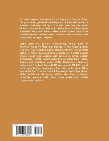 Dr. Lessin explains the Anunnki's involvement in human history. The giant olden gods--folks with high tech & their heirs--chain us to short, hard lives. The "gods"rocketed here from the planet Nibiru & bred with Homo Erectus to create us as short term slaves & soldiers. We praised them & killed in their names: Allah = the Sumerian Nannar, Yahweh = Enlil , Adanoi = Enki. Read this book & transcend the "gods'"religions. Sasha Lessin Ph.D (U.C.L.A. Anthropology Ph.D.), author of Anunnaki: Gods No More and producer of the hugely popular web site, www.enkispeaks.com, studied with the late Zecharia Sitchin, for many years. Mr. Sitichin asked Lessin to create popular internet, book and college-level courses to revise ancient anthropology. Sitchin asked Lessin to help disseminate written, graphic and traditional stories of ETs, hithertofore considered mythic "gods" on Earth from 450,000 years ago to 300 B.C. as well as the latest findings in astronomy that relate to the planet Nibiru.