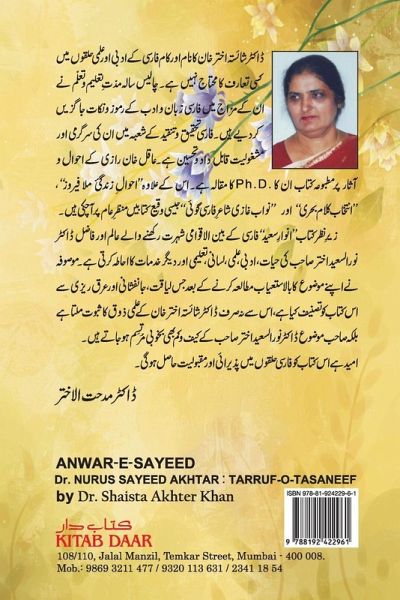 Shaista Khan is a well known Persian langauage scholar and a Teacher. She wrote this book on Dr. Nusus Saeed Akhtar's life and his work in Urdu literature. Dr. Nusus Saeed Akhtar was also had a good command on Persian Language & he was write various books on different topics. Shaista Khan's this book cover all his life and work.