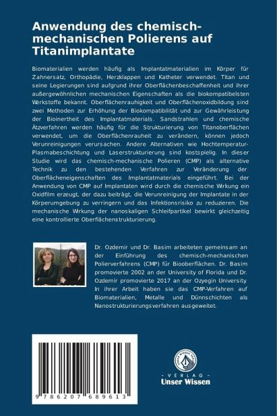 Biomaterialien werden häufig als Implantatmaterialien im Körper für Zahnersatz, Orthopädie, Herzklappen und Katheter verwendet. Titan und seine Legierungen sind aufgrund ihrer Oberflächenbeschaffenheit und ihrer außergewöhnlichen mechanischen Eigenschaften als die biokompatibelsten Werkstoffe bekannt. Oberflächenrauhigkeit und Oberflächenoxidbildung sind zwei Methoden zur Erhöhung der Biokompatibilität und zur Gewährleistung der Bioinertheit des Implantatmaterials. Sandstrahlen und chemische Ätzverfahren werden häufig für die Strukturierung von Titanoberflächen verwendet, um die Oberflächenrauheit zu verändern, können jedoch Verunreinigungen verursachen. Andere Alternativen wie Hochtemperatur-Plasmabeschichtung und Laserstrukturierung sind kostspielig. In dieser Studie wird das chemisch-mechanische Polieren (CMP) als alternative Technik zu den bestehenden Verfahren zur Veränderung der Oberflächeneigenschaften des Implantatmaterials eingeführt. Bei der Anwendung von CMP auf Implantaten wird durch die chemische Wirkung ein Oxidfilm erzeugt, der dazu beiträgt, die Verunreinigung der Implantate in der Körperumgebung zu verringern und das Infektionsrisiko zu reduzieren. Die mechanische Wirkung der nanoskaligen Schleifpartikel bewirkt gleichzeitig eine kontrollierte Oberflächenstrukturierung.