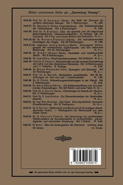 Plancks Strahlungsgesetz.- Theorie der spezifischen Wärme.- 1. Kapitel. Atomwärme fester Körper; Theorie von P. Debye und von M. Born und Th. v. Kármán.- Formulierung des Problems.- Verteilungsgesetz von Debye.- Atomwärme nach Debye.- Charakteristische Temperatur.- Grenzgesetze.- Verteilung der Eigenschwingungen nach Born und v. Kármán.- Atomwärme nach Born.- 2. Kapitel. Atomwärme fester Körper; monoehromatisehe Theorien.- Theorie von Einstein.- Formeln von Nernst und von Nernst und Lindemann.- Molekulargewichtsbestimmung kristallisierter Stoffe.- 3. Kapitel. Über die Schwingungszahl v; Zusammenstellung der Formeln für die Atomwärmen.- Beziehung der Schwingungszahl v zu elastischen und thermischen Konstanten.- Beziehung der Schwingungszahl v zu ultraroten Eigenfrequenzen.- Zusammenstellung der Formeln.- Zwei Beispiele guter Übereinstimmung.- 4. Kapitel. Die Zustandsgleichung des festen Körpers.- Thermodynamisches Potential.- Abweichungen vom Hookeschen Gesetz.- Behandlung unsymmetrischer Schwingungen.- Thermische Ausdehnung fester Körper.- Veränderlichkeit der Schwingungszahl v.- Elektrizitäts-und Wärmeleitung.- 5. Kapitel. Die Rotationsenergie der Gase.- Berechnung der Rotationsenergie nach Nernst.- Theorie von Einstein und Stern.- Theorie von Bjerrum und Ehrenfest.- Verbesserungen von Reiche und Rotszayn.- Optischer Nachweis des Rotationsspektrums.- Theorie von Schwarzschild.- 6. Kapitel. Translatorisehe Energie der Gase. Gasentartung.- Elementargebiete in der kinetischen Theorie der Gase.- Berechnung des Elementargebietes g.- Sommerfelds Gastheorie.- Gasentartung nach Nernst.- Namenregister.