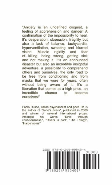 "Anxiety is an undefined disquiet, a feeling of apprehension and danger! A confirmation of the impossibility to heal. It's desperation, obsession, fragility but also a lack of balance, tachycardia,hyperventilation,sweating and blurred vision. Muscle rigidity and fear of...killing, being wrong, getting sick and not making it. It's an announced disaster but also an incredible insightful adventure, a possibility to comprehend others and ourselves, the only road to be free from conditioning and from masks that we wore for years, often without being aware of it. It's a liberation that comes at a high price , an incredible chance to become ourselves!"