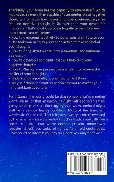 Thankfully, your brain has the capacity to rewire itself, which means you're more than capable of overcoming these negative thoughts. No matter how powerful or overwhelming they may feel, no negative thought is stronger than your desire for success. That's what this book aims to prove.In this book, you will learn:How to overcome negativity by using your brain to save youThe tools you need to prevent anxiety and take control of your thoughtsHow to bring about a shift in your emotions and minimize depressionHow to develop good habits that will help curb your negative thoughtsHow to change your perspective and learn to become the master of your thoughtsUnderstanding paradigms and how to shift themWhy self-discipline matters as you attempt to master your mind and boost your brain For instance, the worry could be that someone we're meeting won't like us; or that an upcoming flight will lead to an emergency landing; or that the nagging pain we've noticed might well be a serious health condition. Most of the time, our worries don't pan out. That's because worry is often invented by the mind, and is rarely rooted in fact or truth. Eventually, we come to realize that worry doesn't prevent tomorrow's troubles, it just robs today of its joy. As an old quote goes: "Worry is the interest you pay on a debt you may not owe."