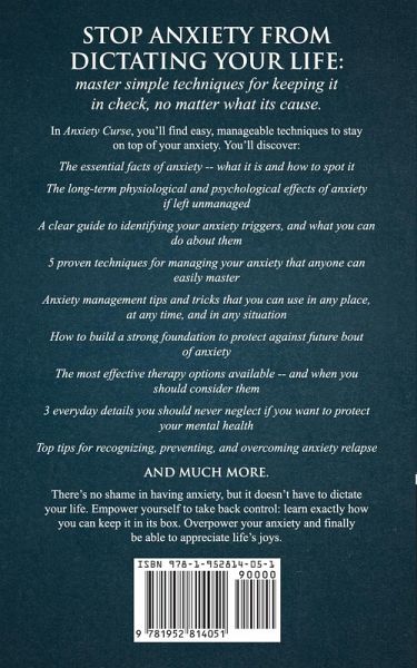 Stop anxiety from dictating your life: master simple techniques for keeping it in check, no matter what its cause. Anxiety is the most common mental health issue in the USA, affecting an estimated 40 million adults. Despite its prevalence, only a third of those affected by it seek treatment, often hoping it will go away on its own. Anxiety doesn't go away on its own, but that doesn't mean you necessarily need to seek treatment. In many cases, it's possible to get control over your anxiety without professional help: it won't go away on its own, but you can learn the tools to keep it in check -- and they're skills that anyone can master. The thing about anxiety is that it follows patterns: its causes and presentations may vary from person to person, but the physical and psychological effects are similar. This means that once you learn your triggers, you can apply certain techniques to reverse your symptoms. * Does your anxiety ever stop you from doing things you wish you could do? * Does the idea of meeting new people or speaking in public make you queasy? * Are you plagued by worry about the future or regret about the past? * Do you sometimes have trouble sleeping because you can't quiet your mind? If you answered 'yes' to any of these questions, it's a sign that your anxiety has taken control. It's time to take that control back. And it's easier than you might imagine. In Anxiety Curse, you'll find easy, manageable techniques to stay on top of your anxiety. You'll discover: * The essential facts of anxiety -- what it is and how to spot it * The long-term physiological and psychological effects of anxiety if left unmanaged * A clear guide to identifying your anxiety triggers, and what you can do about them * 5 proven techniques for managing your anxiety that anyone can easily master * Anxiety management tips and tricks that you can use in any place, at any time, and in any situation * How to build a strong foundation to protect against future bouts of anxiety * The most effective therapy options available -- and when you should consider them * 3 everyday details you should never neglect if you want to protect your mental health * Top tips for recognizing, preventing, and overcoming anxiety relapse And much more. If anxiety has become a regular part of your life, you already know you're not alone. But you don't have to 'just live with it.' If you had a headache, you wouldn't think twice about rehydrating or reaching for a painkiller: learn the strategies to keep your anxiety under control too. There's no shame in having anxiety, but it doesn't have to dictate your life. Empower yourself to take back control: learn exactly how you can keep it in its box. If you're ready to overpower your anxiety and finally be able to appreciate life's joys, then scroll up and click "Add to Cart" right now.