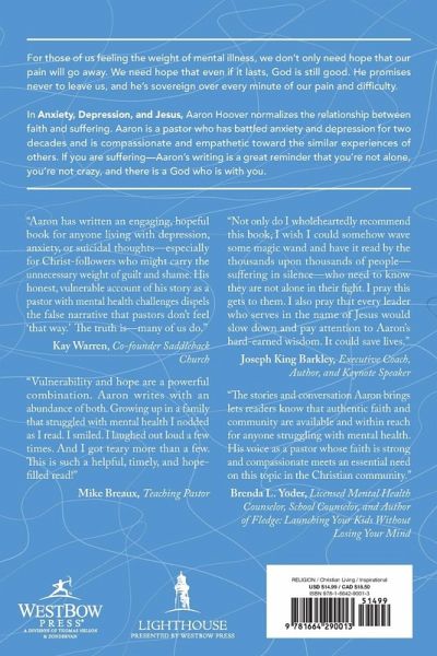 For those of us feeling the weight of mental illness, we don't only need hope that our pain will go away. We need hope that even if it lasts, God is still good. He promises never to leave us, and he's sovereign over every minute of our pain and difficulty. In Anxiety, Depression, and Jesus, Aaron Hoover normalizes the relationship between faith and suffering. Aaron is a pastor who has battled anxiety and depression for two decades and is compassionate and empathetic toward the similar experiences of others. If you are suffering-Aaron's writing is a great reminder that you're not alone, you're not crazy, and there is a God who is with you.