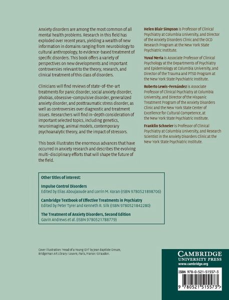 Foreword Jeffrey Lieberman; 1. Introduction: the need for an interdisciplinary approach Helen Blair Simpson, Yuval Neria, Roberto Lewis-Fernández and Franklin R. Schneier; Part I. Evolving Concepts of Anxiety: 2. The epidemiology of anxiety disorders Jonathan S. Comer and Mark Olfson; 3. Development of the nosology of anxiety disorders Michael B. First, Desiree K. Caban and Roberto Lewis-Fernández; 4. The emergence of social phobia as a major medical condition Michael R. Liebowitz; 5. Anxiety as signal, symptom and syndrome Robert A. Glick and Steven P. Roose; 6. New concepts in the evolution and development of anxiety Myron A. Hofer; Part II. Challenges in Diagnosing Pathological Anxiety: 7. Challenges in OCD research: overcoming heterogeneity Anthony Pinto, Marco A. Grados and Helen Blair Simpson; 8. Is there a spectrum of social anxiety disorder? Franklin R. Schneier and Jami Socha; 9. Co-occurring anxiety and depression: concepts, significance, and treatment implications Patrick J. McGrath and Jeffrey M. Miller; 10. Understanding health anxiety Kelli Jane K. Harding, Natalia Skritskaya, Emily R. Doherty and Brian A. Fallon; 11. Axis II and anxiety disorders Matthew J. Kaplowitz and John C. Markowitz; 12. 'Idioms of distress' (culturally salient indicators of distress) and anxiety disorders Devon E. Hinton and Roberto Lewis-Fernández; Part III. Understanding the Causes of Anxiety: 13. Current status of research in the genetics of anxiety disorders Nicole R. Nugent, Myrna Weissman, Abby Fyer and Karestan C. Koenen; 14. Animal models of anxiety disorders: behavioral and genetic approaches Jesse W. Richardson-Jones, E. David Leonardo, Rene Hen and Susanne E. Ahmari; 15. Role of the cortex in the regulation of anxiety states Noelia V. Weisstaub, Caitlin McOmish, James Hanks and Jay A. Gingrich; 16. Learned fear and innate anxiety in rodents and their relevance to human anxiety disorders Joshua A. Gordon and Avishek Adhikari; 17. Brain systems underlying anxiety disorders: a view from neuroimaging Amit Etkin and Tor D. Wager; 18. Cognitive-behavioral treatment of anxiety disorders: model and current issues James P. Hambrick, Jonathan S. Comer and Anne Marie Albano; 19. The stressor Criterion A in post-traumatic stress disorder: issues, evidence, and implications Bruce Dohrenwend; 20. Attachment, separation, and anxiety disorders Elizabeth Sagurton Mulhare, Angela Ghesquiere and M. Katherine Shear; 21. Non-human primate models in understanding anxiety Navin A. Natarajan, Ranjeeb Shrestha and Jeremy D. Coplan; Part IV. Treatment of Anxiety: Current Status and Controversial Issues: 22. Evidence-based treatment for patients with obsessive-compulsive disorder: questions and controversies Carolyn Rodriguez and Helen Blair Simpson; 23. Treatment of social anxiety disorder Franklin R. Schneier, Kristin Pontoski and Richard G. Heimberg; 24. Treatment of post-traumatic stress disorder Gregory M. Sullivan, Eun Jung Suh and Yuval Neria; 25. Panic disorder Smit S. Sinha and Donald F. Klein; 26. Treatment of late-life generalized anxiety disorder Laszlo A. Papp, Ethan E. Gorenstein and Jan Mohlman; 27. Childhood anxiety disorders: best treatment options and practice Hilary B. Vidair and Moira A. Rynn; 28. Brain stimulation in the treatment of anxiety disorders Antonio Mantovani and Sarah H. Lisanby; 29. Complementary and alternative medicine approaches to the treatment of anxiety Sapana R. Patel, Anthony J. Tranguch and Philip R. Muskin; 30. The treatment of anxiety disorders in primary care Mayumi Okuda, Sharaf S. Khan, Ana Alicia de la Cruz and Carlos Blanco; 31. Future directions Helen Blair Simpson, Yuval Neria, Roberto Lewis-Fernández and Franklin R. Schneier; Index.