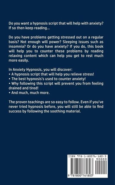 Do you want a hypnosis script that will help with anxiety? If so then keep reading... Do you have problems getting stressed out on a regular basis? Not enough will power? Sleeping issues such as insomnia? Or do you have anxiety? If you do, this book will help you to counter these problems by reading relaxing content which can help you get to rest much more easily. In Anxiety Hypnosis, you will discover:A hypnosis script that will help you relieve stress! The best hypnosis's used to counter anxiety! Why following this script will prevent you from feeling drained and tired! And much, much more. The proven teachings are so easy to follow. Even if you've never tried hypnosis before, you will still be able to find success by following the soothing material. So, if you're ready to start your journey to have much better fulfilling life, then click the "BUY NOW" button!