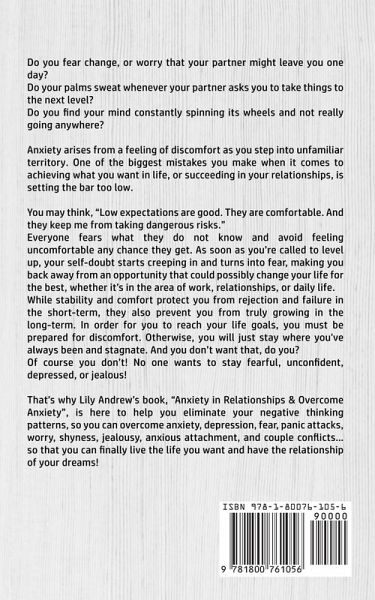 Stop Anxiety Dead in Its Tracks & Become the Confident, Emotionally Secure, & Positive Person You're Always Meant to Be! Do you fear change, or worry that your partner might leave you one day? Do your palms sweat whenever your partner asks you to take things to the next level? Do you find your mind constantly spinning its wheels and not really going anywhere? Anxiety arises from a feeling of discomfort as you step into unfamiliar territory. One of the biggest mistakes you make when it comes to achieving what you want in life, or succeeding in your relationships, is setting the bar too low. You may think, "Low expectations are good. They are comfortable. And they keep me from taking dangerous risks." Everyone fears what they do not know and avoid feeling uncomfortable any chance they get. As soon as you're called to level up, your self-doubt starts creeping in and turns into fear, making you back away from an opportunity that could possibly change your life for the best, whether it's in the area of work, relationships, or daily life. While stability and comfort protect you from rejection and failure in the short-term, they also prevent you from truly growing in the long-term. In order for you to reach your life goals, you must be prepared for discomfort. Otherwise, you will just stay where you've always been and stagnate. And you don't want that, do you? Of course you don't! No one wants to stay fearful, unconfident, depressed, or jealous! That's why Lily Andrew's book, "Anxiety in Relationships & Overcome Anxiety", is here to help you eliminate your negative thinking patterns, so you can overcome anxiety, depression, fear, panic attacks, worry, shyness, jealousy, anxious attachment, and couple conflicts... so that you can finally live the life you want and have the relationship of your dreams! Over the course of this life-changing guide, you will: Make Permanent Mindset Changes to remove anxiety while replacing it with radiating confidence and positive energy without drugs or medication Skyrocket Your Social Confidence and bring the right friends, business connections, and romantic relationships in your life Thrive in a Nurturing Relationship by growing together as individuals while removing negative patterns, anxiety, and jealousy Develop Clear Communication about any topic without feeling insecure or judged by the other person for your feelings and emotions And so much more! Anxiety in relationships and your personal life is normal. A big part of growth is taking chances and embracing new opportunities, despite the fear, shyness, panic attacks, worry, jealousy, and all other negative emotions that consume you. In this guide, you will only get information gleaned from hundreds of research done on overcoming anxiety, so that you can become a better partner as well as a better, more confident, and more secure person! Take back control and overcome your anxiety today!