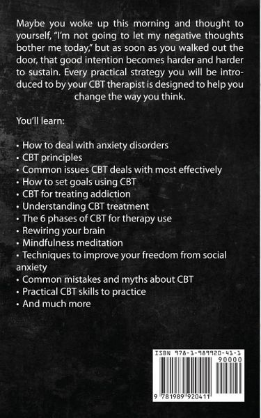 Maybe you woke up this morning and thought to yourself, "I'm not going to let my negative thoughts bother me today," but as soon as you walked out the door, that good intention becomes harder and harder to sustain. Every practical strategy you will be introduced to by your CBT therapist is designed to help you change the way you think. You'll learn: How to deal with anxiety disordersCBT principlesCommon issues CBT deals with most effectivelyHow to set goals using CBTCBT for treating addictionUnderstanding CBT treatmentThe 6 phases of CBT for therapy useRewiring your brainMindfulness meditationTechniques to improve your freedom from social anxietyCommon mistakes and myths about CBTPractical CBT skills to practiceAnd much more