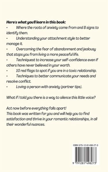 Does thinking about the future of your relationship always leave you imagining the worst-case scenario? Do you constantly live with a sense of insecurity? Are you in a relationship but you feel like there's too much negative energy? Picture this: it is the scenario of the beginning of a relationship that is going very well. There is a high level of mutual understanding, communication is fantastic and clear, except for some doubts that plague you. A little voice creeps into your head: "Why would anyone be interested in me?" "Am I really up to it?" "Does she or he love me enough?", "What if she or he leaves me?", "Am I a romantic disaster?", "What if she or he is cheating on me?", "Can I live without this person?" In some cases, these questions linger on even after 'I love you' has been exchanged in the relationship. When a person starts to feel anxious about life with a current or prospective partner, it is an understandable worry-this is a big part of their lives. However, in certain cases, this worry becomes so crippling, it can prevent the relationship from flourishing, or even taking off. Fortunately, it is possible to defuse these negative thoughts and get your relationship off the ground. Here's what you'll learn in this book: ¿ Where the roots of anxiety come from and 8 signs to identify them. ¿ Understanding your attachment style to better manage it. ¿ Overcoming the fear of abandonment and jealousy that stops you from living a more peaceful life. ¿ Techniquest to increase your self-confidence even if others have never believed in your worth. ¿ 10 red flags to spot if you are in a toxic relationship. ¿ Techniques to better communicate your needs and resolve conflict. ¿ Loving a person with anxiety (partner tips). What if I told you there is a way to silence this little voice? Act now before everything falls apart! This book was written for you and will help you to find satisfaction and thrive in your romantic relationships, in all their wonderful nuances.