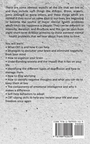 There are some obvious aspects of the life that we live in, and they include such things like distress, stress, anxiety, panic amongst so many others, and these things which are normal if they occur on some days in our lives, are beginning to become the source of major mental health problems which limits the happiness in people. They can be different in intensity, duration, and structure, and this can be seen from slight short-term stressor ailments to those extreme mental health problems that we hear about from time to time.You will learn:What CBT is and how it can helpStrategies to declutter your brain and eliminate negativity from your mindHow to organize your brainUnderstanding anxiety and the impact that it has on your lifeIdentifying the different types of depression and how to manage themHow to stop worryingHow to identify negative thoughts and what you can do to keep them at bayThe components of emotional intelligence and why it makes a differenceSelf-help behaviors to adoptCBT coping skills to help you reclaim your life and your freedom once again