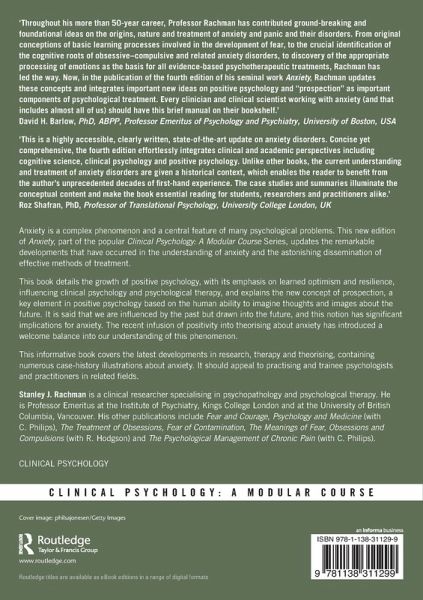 'Throughout his more than 50-year career, Professor Rachman has contributed ground-breaking and foundational ideas on the origins, nature and treatment of anxiety and panic and their disorders. From original conceptions of basic learning processes involved in the development of fear, to the crucial identification of the cognitive roots of obsessive-compulsive and related anxiety disorders, to discovery of the appropriate processing of emotions as the basis for all evidence-based psychotherapeutic treatments, Rachman has led the way. Now, in the publication of the fourth edition of his seminal work Anxiety, Rachman updates these concepts and integrates important new ideas on positive psychology and "prospection" as important components of psychological treatment. Every clinician and clinical scientist working with anxiety (and that includes almost all of us) should have this brief manual on their bookshelf.'