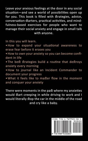 Leave your anxious feelings at the door in any social situation-and see a world of possibilities open up for you. This book is filled with strategies, advice, conversation-starters, practical activities, and mindfulness-based exercises for people who want to manage their social anxiety and engage in small talk with anyone. In this you will learn. • How to expand your situational awareness to erase fear before it erases you • How to own your anxiety so you can become confident in life • The best strategies build a routine that destroys anxiety every morning • How to journal like an Incident Commander to document your progress • What it feels like to master flow in the moment and conquer your anxiety There were moments in the past where my anxieties would start creeping in while driving to work and I would literally stop the car in the middle of the road and cry like a baby.