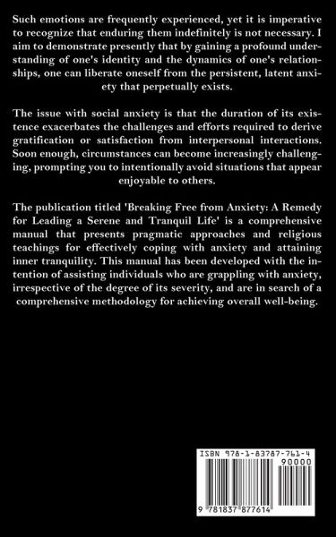 Such emotions are frequently experienced, yet it is imperative to recognize that enduring them indefinitely is not necessary. I aim to demonstrate presently that by gaining a profound understanding of one's identity and the dynamics of one's relationships, one can liberate oneself from the persistent, latent anxiety that perpetually exists. The issue with social anxiety is that the duration of its existence exacerbates the challenges and efforts required to derive gratification or satisfaction from interpersonal interactions. Soon enough, circumstances can become increasingly challenging, prompting you to intentionally avoid situations that appear enjoyable to others. The publication titled 'Breaking Free from Anxiety: A Remedy for Leading a Serene and Tranquil Life' is a comprehensive manual that presents pragmatic approaches and religious teachings for effectively coping with anxiety and attaining inner tranquility. This manual has been developed with the intention of assisting individuals who are grappling with anxiety, irrespective of the degree of its severity, and are in search of a comprehensive methodology for achieving overall well-being.