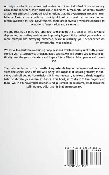 Anxiety disorder. It can cause considerable harm to an individual. It is a potentially permanent condition. Individuals experiencing mild, moderate, or severe anxiety attacks experience an outpouring of emotions that the average person could never fathom. Anxiety is amenable to a variety of treatments and medications that are readily available for use. Nevertheless, there are individuals who are opposed to the notion of medication and treatment. Are you seeking an all-natural approach to managing the stresses of life, alleviating depression, controlling anxiety, and improving hyperactivity so that you can lead a more tranquil and satisfying existence, while minimising your dependence on pharmaceutical medications? We strive to assist you in attaining happiness and satisfaction in your life. By providing you with astute advice and actionable tactics, we will enable you to regain authority over the grasp of anxiety and forge a future filled with happiness and meaning. The detrimental impact of overthinking extends beyond interpersonal relationships and affects one's mental well-being. It is capable of inducing anxiety, melancholy, and self-doubt. Nevertheless, it is not necessary to allow a single negative habit to dictate your entire existence. This book, in contrast to the majority of them, which offer overnight solutions and quick fixes for problems, emphasises the self-imposed adjustments that are necessary.
