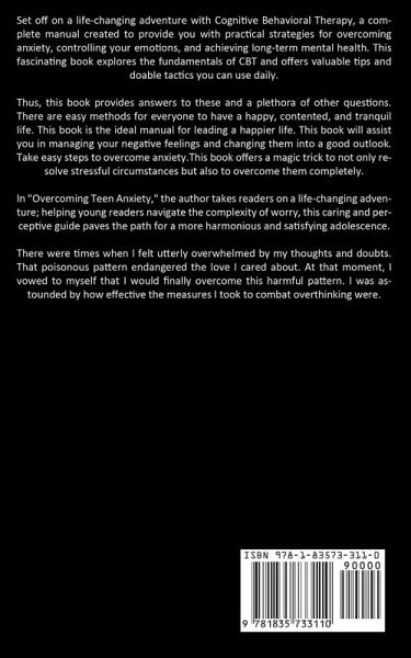 Set off on a life-changing adventure with Cognitive Behavioral Therapy, a complete manual created to provide you with practical strategies for overcoming anxiety, controlling your emotions, and achieving long-term mental health. This fascinating book explores the fundamentals of CBT and offers valuable tips and doable tactics you can use daily. Thus, this book provides answers to these and a plethora of other questions. There are easy methods for everyone to have a happy, contented, and tranquil life. This book is the ideal manual for leading a happier life. This book will assist you in managing your negative feelings and changing them into a good outlook. Take easy steps to overcome anxiety. This book offers a magic trick to not only resolve stressful circumstances but also to overcome them completely. In "Overcoming Teen Anxiety," the author takes readers on a life-changing adventure; helping young readers navigate the complexity of worry, this caring and perceptive guide paves the path for a more harmonious and satisfying adolescence. There were times when I felt utterly overwhelmed by my thoughts and doubts. That poisonous pattern endangered the love I cared about. At that moment, I vowed to myself that I would finally overcome this harmful pattern. I was astounded by how effective the measures I took to combat overthinking were.