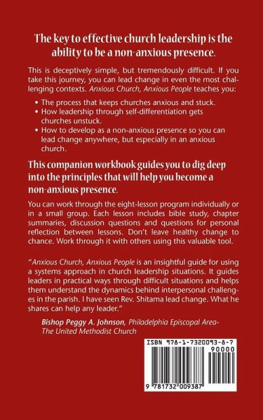 The key to effective church leadership is the ability to be a non-anxious presence. This is deceptively simple, but tremendously difficult. If you take this journey, you can lead change in even the most challenging contexts. Anxious Church, Anxious People teaches you: •The process that keeps churches anxious and stuck •How leadership through self-differentiation gets churches unstuck. •How to develop as a non-anxious presence so you can lead change anywhere, but especially in an anxious church. This COMPANION WORKBOOK guides you to dig deep into the principles that will help you become a non-anxious presence.You can work through the eight-lesson program individually or in a small group. Each lesson includes bible study, chapter summaries, discussion questions and questions for personal reflection between lessons. Don't leave healthy change to chance. Work through it with others using this valuable tool.