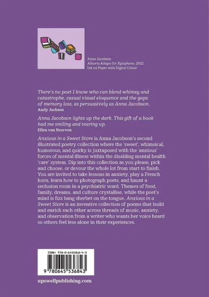 Anna Jacobson mixes up the fiercely serious with the whimsical in her second book of poems, exploring a daily life of navigating small rituals and routines along with anxiety, a crippling companion. Anxious in a Sweet Store is Anna Jacobson's second illustrated poetry collection where the 'sweet', whimsical, humorous, and quirky is juxtaposed with the 'anxious' and disabling forces of mental illness. Themes of food, family, dreams, and culture crystallise, while the poet's mind is fizz bang sherbet on the tongue. Anxious in a Sweet Store is an inventive collection of poems that build and enrich each other across threads of music and anxiety and beyond.