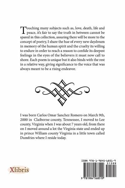 Touching many subjects such as, love, death, life, and peace, it's fair to say the truth in between cannot be spared in this collection, assuring there will be more to the concept of poetry. I share the hue of every new daydream in memory of the human spirit and the cruelty it is willing to endure in order to reach a reason to confide its deepest feelings in the eyes of the believers. It must now call to shore. Each poem is unique, but it also binds with the rest in a relative way, giving significance to the voice that was always meant to be a rising endeavor.