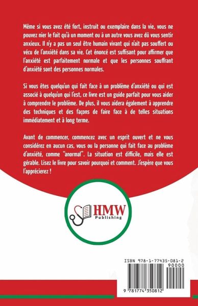 Même si vous avez été fort, instruit ou exemplaire dans la vie, vous ne pouvez nier le fait qu’à un moment ou à un autre vous avez dû vous sentir anxieux. Il n’y a pas un seul être humain vivant qui n’ait pas souffert ou vécu de l’anxiété dans sa vie. Cet énoncé est suffisant pour affirmer que l’anxiété est parfaitement normale et que les personnes souffrant d’anxiété sont des personnes normales. Si vous êtes quelqu’un qui fait face à un problème d’anxiété ou qui est associé à quelqu’un qui l’est, ce livre est un guide parfait pour vous aider à comprendre le problème. De plus, il vous aidera également à apprendre des techniques et des façons de faire face à de telles situations immédiatement et à long terme. Avant de commencer, commencez avec un esprit ouvert et ne vous considérez en aucun cas, vous ou la personne qui fait face au problème d’anxiété, comme "anormal". La situation est difficile, mais elle est gérable. Lisez le livre pour savoir pourquoi et comment. J’espère que vous l’apprécierez !