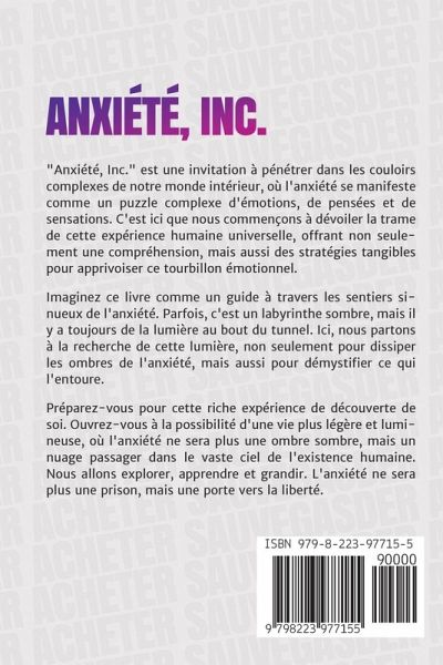 "Anxiété, Inc." est une invitation à pénétrer les couloirs complexes de notre monde intérieur, où l'anxiété se manifeste comme un puzzle complexe d'émotions, de pensées et de sensations. C'est ici que nous commençons à dévoiler le tissu de cette expérience humaine universelle, offrant non seulement une compréhension, mais aussi des stratégies tangibles pour dompter ce tourbillon émotionnel. Imaginez ce livre comme un guide à travers les sentiers sinueux de l'anxiété. Parfois, c'est un labyrinthe sombre, mais il y a toujours de la lumière au bout du tunnel. Ici, nous partons à la recherche de cette lumière, non seulement pour dissiper les ombres de l'anxiété, mais aussi pour démystifier ce qui l'entoure. Ouvrez-vous à la possibilité d'une vie plus légère et illuminée, où l'anxiété ne sera plus une ombre sombre, mais un nuage passager dans le vaste ciel de l'existence humaine. Nous allons explorer, apprendre et grandir. L'anxiété ne sera plus une prison, mais une porte vers la liberté. Préparez-vous pour cette riche expérience de découverte de soi.