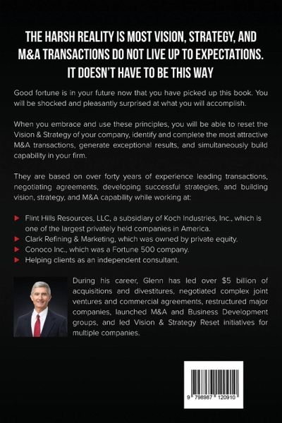 The harsh reality Is most vision, strategy, and M&A transactions do not live up to expectations. It doesn't have to be this way. When you embrace and use the principles in this book, you will be able to reset the Vision & Strategy of your company, identify and complete the most attractive M&A transactions, generate exceptional results, and simultaneously build capability in your firm. They are based on over forty years of experience leading transactions, negotiating agreements, developing successful strategies, and building vision, strategy, and M&A capability while working at: · Flint Hills Resources, LLC, a subsidiary of Koch Industries, Inc., which is one of the largest privately held companies in America. · Clark Refining & Marketing, which was owned by private equity. · Conoco Inc., which was a Fortune 500 company. · Helping clients as an independent consultant. During his career, Glenn has led over $5 billion of acquisitions and divestitures, negotiated complex joint ventures and commercial agreements, restructured major companies, launched M&A and Business Development groups, and led Vision & Strategy Reset initiatives for multiple companies.