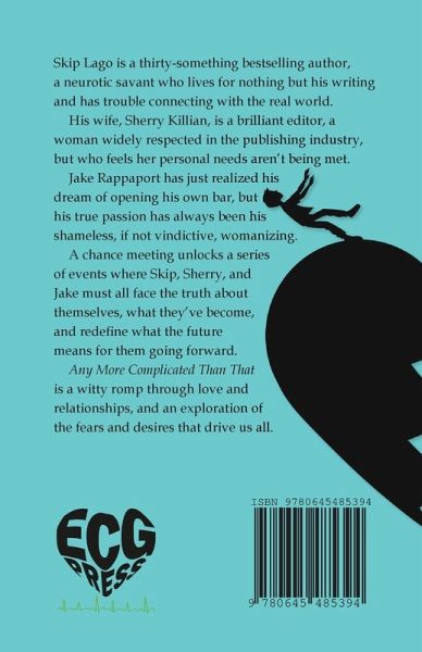 Skip Lago is a thirty-something bestselling author, a neurotic savant who lives for nothing but his writing and has trouble connecting with the real world. His wife, Sherry Killian, is a brilliant editor, a woman widely respected in the publishing industry, but who feels her personal needs aren't being met. Jake Rappaport has just realized his dream of opening his own bar, but his true passion has always been his shameless, if not vindictive, womanizing. A chance meeting unlocks a series of events where Skip, Sherry, and Jake must all face the truth about themselves, what they've become, and redefine what the future means for them going forward. Any More Complicated Than That is a witty romp through love and relationships, and an exploration of the fears and desires that drive us all.