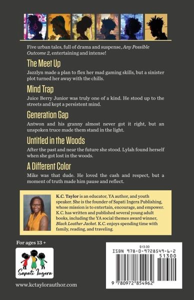 Any Possible Outcome: A Book of Urban Tales 2 is about five teenagers who face life-changing scenarios. Jazzlyn, an online gamer, accepts an invitation to The Meet Up, a secret gaming event, but she nearly escapes a kidnapping. Juice Berry Junior searches for a better future than what his small town can provide, but he must dodge his cousin's plan to trap him into street life. Antwon and his grandmother Gail are always at each other's throats, until one day they encounter unique situations that give way to a silent truce. Lylah is left alone in the woods, when she learns that her family needs rescuing from a group of kooky mountain dwellers. Mike fights a long court battle to prove his innocence over a sensitive crime he did not commit. Jazzlyn made a plan to flex her mad gaming skills, but a sinister plot turned her away with the chills. -The Meet UpJuice Berry Junior was truly one of a kind. He stood up to the streets and kept a persistent mind. -Mind TrapAntwon and his granny almost never got it right, but an unspoken truce made them stand in the light. -Generation GapAfter the past and near the future she stood. Lylah found herself when she got lost in the woods. -Untitled in the Woods Mike was that dude. He loved the cash and respect, but a moment of truth made him pause and reflect. -A Different ColorFive urban tales, full of drama and suspense, APO Part 2, entertaining and intense!