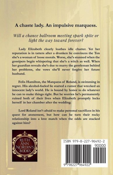 A chaste lady. An impulsive marquess. Will a chance ballroom meeting spark spite or light the way toward forever? Lady Elizabeth Clearly loathes idle chatter. Yet her reputation is in tatters after a drunken lie convinces the Ton she's a woman of loose morals. Worse, she's stunned when the gossipers begin whispering that she's a witch as well. When her guardian reveals she's due to marry the gentleman behind her problems, she vows she'll never forgive her future husband. Felix Hamilton, the Marquess of Roland, is swimming in regret. His alcohol-fueled lie started a rumor that wrecked an innocent lady's world. He is bound by honor to do whatever he can to make things right. But he worries he's permanently ruined both of their lives when Elizabeth promptly locks herself in her chamber after the wedding. Lord Roland isn't afraid to make personal sacrifices in his quest for atonement, but how can he turn their rocky relationship into a love match when the odds are stacked against him? Anyone But the Marquess is Book 5 in the Marriage by Obligation Series. This romance features a virgin hero and virgin heroine, an enemies-to-lovers angle, and a steamy scene. Its tone is tender and sweet with a dash of humor. Don't miss the other books in the Marriage by Obligation Series: Book 1: Secret Admirer Book 2: Midnight Wedding Book 3: The Earl's Jilted Bride Book 4: Worth the Risk and coming 2025... Book 6: The Earl's Bluestocking Bride