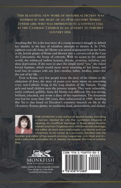 "This beautiful work of historical fiction was inspired by the diary of an actual 18th-century Roman Jewish girl, imprisoned by the Catholic Church because someone with a grudge offered her to the Church. Anything But Yes is the true story of a young woman's struggle to defend her identity in the face of relentless attempts to destroy it. In 1749, 18-year-old Anna del Monte was seized at gunpoint from her home in Rome's Jewish ghetto and thrown into a convent cell at the Casa dei Convertiti, the house of converts. With no access to the outside world, she withstood isolation, sleep deprivation, endless lectures, and threats and promises. If Anna were to utter the simple word "yes," she would risk forced baptism, which meant never returning to her home and losing contact with any Jew-including her own family-for the rest of her life. Even in Italy today, few people know the full story of Rome's Jewish ghetto, the abduction of Jews, or the popes who were intent on forcibly converting every non-Catholic living in the long shadow of the Vatican. Young girls and small children were the primary targets of these forced conversions, for they were most vulnerable. But Anna del Monte was different. She was strong, brilliant, and educated, and wrote a diary of her experiences. Her diary became lost for more than 200 years but was rediscovered in Israel in 1989. Anything But Yes is based on Anna's diary and Joie Davidow's extensive research on life in the 18th-century Roman Jewish ghetto and its personalities, traditions, foods, and dialect"--