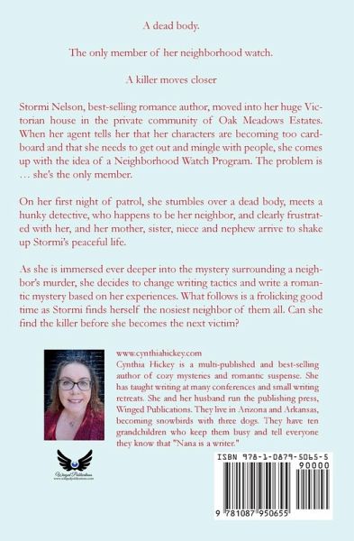 A dead body. The only member of her neighborhood watch. A killer moves closer Stormi Nelson, best-selling romance author, moved into her huge Victorian house in the private community of Oak Meadows Estates. When her agent tells her that her characters are becoming too cardboard and that she needs to get out and mingle with people, she comes up with the idea of a Neighborhood Watch Program. The problem is ... she's the only member. On her first night of patrol, she stumbles over a dead body, meets a hunky detective, who happens to be her neighbor, and clearly frustrated with her, and her mother, sister, niece and nephew arrive to shake up Stormi's peaceful life. As she is immersed ever deeper into the mystery surrounding a neighbor's murder, she decides to change writing tactics and write a romantic mystery based on her experiences. What follows is a frolicking good time as Stormi finds herself the nosiest neighbor of them all. Can she find the killer before she becomes the next victim?