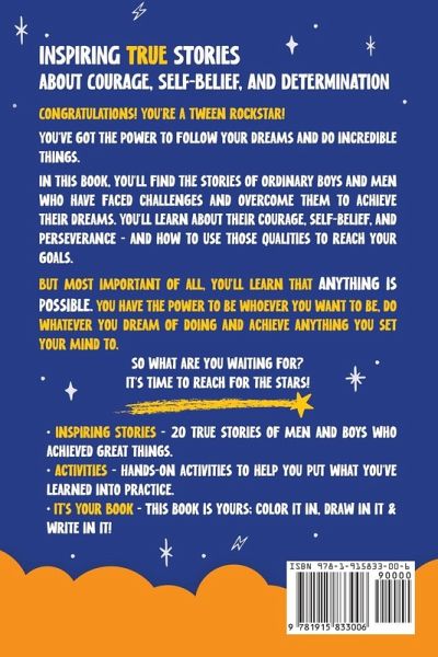 INSPIRING TRUE STORIES ABOUT COURAGE, SELF-BELIEF, AND DETERMINATION.-> The perfect gift for TWEEN BOYS - Ages 8-13 <- The tween years can be tricky. You're not quite a teenager, but you're also not a little kid. It's a time when you're trying to figure out who you are and what you want to be. And sometimes, that can be scary. The great news is you're not alone. Anything is Possible, by Tween Success, is a collection of 20 inspiring true stories of incredible boys and men who have overcome obstacles and challenges to achieve amazing things. You'll learn about their courage, self-belief, and perseverance - and how to use those qualities to reach your goals. Some of them you might already have heard of. Others you'll learn about for the first time. But they all have one thing in common: they refused to give up on their dreams. ¿¿You'll meet:A drummer who lost his arm in a car accident but got back on stage soon after and is now one of the best drummers in the world. An entrepreneur who was turned down for a job at KFC and is now a billionaire. A self-taught inventor who, at just 14 years old, built a windmill out of junk to supply electricity to his family home. And many more! You'll learn about:Overcoming obstacles Being resilient in the face of setbacks The power of positive thinking The importance of hard work Taking risks and overcoming failure These stories will show you that anyone can achieve great things with courage, self-belief, and perseverance, no matter who they are or where they come from. You can take part: At the end of each chapter, you will find an activity related to the stories you just read. These activities will help you put what you've learned into practice. Now let's get started on this journey together. Are you ready? Anything is possible!