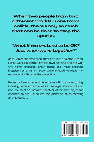 When two people from two different worlds in one town collide, there's only so much that can be done to stop the sparks. "What if we pretend to be OK? Just when we're together?" Jake McManus was sure that he'd left Overton Beach, North Carolina behind him. His own demons and the way the town changed after being the main shooting location for a hit TV show were enough to make him move on. Until he saw Rebecca Klein. Rebecca Klein is taking the summer off from everything. Chasing fame since she was a teenager, she's burnt out, not to mention broken hearted after her boyfriend cheated on her. Of course she didn't count on meeting Jake McManus.
