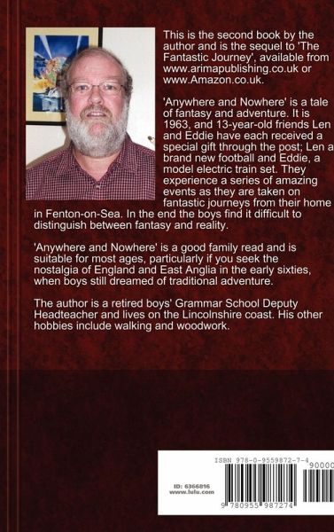 This is the casewrap-hardcover version of the 2nd in a series of 4 books and is the sequel to 'The Fantastic Journey', published by Arima, available from their website or from Amazon, ISBN 978-1-84549-311-0. The 3rd: 'The Haunting of Eddie Compton' is also available from Lulu.com, as is the 4th: 'Heaven on Earth'. 'Anywhere And Nowhere' is a tale of fantasy and adventure. It is 1963, and friends Len and Eddie have each received a special gift through the post. They are then taken on fantastic journeys from their home in Fenton-on-Sea. In the end the boys find it difficult to distinguish between fantasy and reality. 'Anywhere And Nowhere' is a good family read and is suitable for most ages, particularly if the reader seeks the nostalgia of England and, particularly, East Anglia, in the early sixties when 13-year-old-boys still dreamed of traditional adventure. The author is a retired Deputy Headteacher of a boys' Grammar School and lives on the Lincolnshire coast.