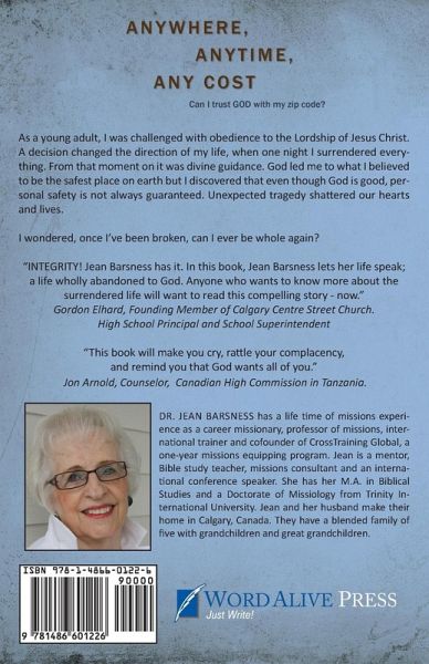 As a young adult, I was challenged with obedience to the Lordship of Jesus Christ. A decision changed the direction of my life, when one night I surrendered everything. From that moment on it was divine guidance. God led me to what I believed to be the safest place on earth but I discovered that even though God is good, personal safety is not always guaranteed. Unexpected tragedy shattered our hearts and lives. I wondered, once I've been broken, can I ever be whole again? "INTEGRITY! Jean Barsness has it. In this book, Jean Barsness lets her life speak; a life wholly abandoned to God. Anyone who wants to know more about the surrendered life will want to read this compelling story - now." Gordon Elhard, Founding Member of Calgary Centre Street Church. High School Principal and School Superintendent "This book will make you cry, rattle your complacency, and remind you that God wants all of you." Jon Arnold, Counselor, Canadian High Commission in Tanzania. About the Author: Dr. Jean Barsness has a life time of missions experience as a career missionary, professor of missions, international trainer and cofounder of CrossTraining Global, a one-year missions equipping program. Jean is a mentor, Bible study teacher, missions consultant and an international conference speaker. She has her M.A. in Biblical Studies and a Doctorate of Missiology from Trinity International University. Jean and her husband make their home in Calgary, Canada. They have a blended family of five with grandchildren and great grandchildren.