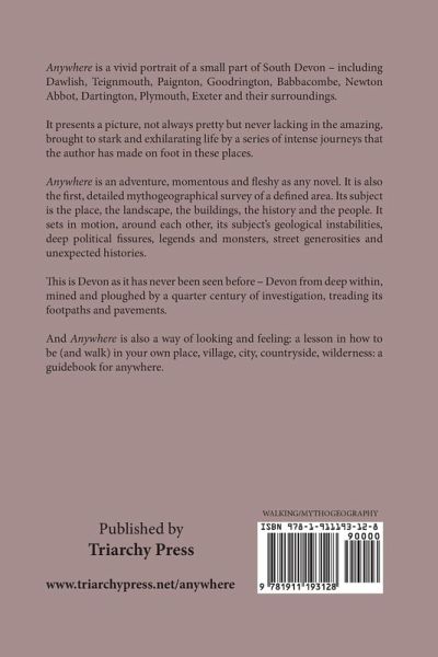 Mythogeographer Phil Smith has been walking, exploring, photographing, filming, talking and writing about South Devon for about 20 years. He has absorbed it, and it him. In Anywhere, walking and writing as Cecile Oak (a young PhD student of Symbolist art and performance who is invited to report on a Radical Walking conference in Paignton) Phil offers us an extraordinarily vivid portrait of a small part of South Devon - including Dawlish, Teignmouth, Paignton, Goodrington, Babbacombe, Dartington, Newton Abbot, Plymouth, Exeter and their surroundings. The picture he presents is not always pretty but never short of startling and sometimes jaw-dropping detail. Ad it's all brought to exhilarating life in this account of a series of intense journeys that he has made on foot in these places. Anywhere is an adventure, momentous and fleshy as any novel. It is also the first, detailed mythogeographical survey of a defined area. Its subject is the place, the landscape, the buildings, the history and the people. It sets in motion, around each other, its subject's geological instabilities, deep political fissures, legends and monsters, street generosities and unexpected histories. This is Devon as it has never been seen before - Devon from deep within, mined and ploughed by a quarter century of investigation, treading its footpaths and pavements. And Anywhere is also a way of looking and feeling: a lesson in how to be (and walk) in your own place, village, city, countryside, wilderness: a guidebook for anywhere. ¿ - See more at: http://www.triarchypress.net/anywhere.html#sthash.XRHGrG4b.dpuf
