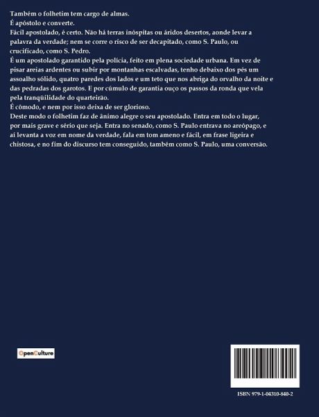 Também o folhetim tem cargo de almas. É apóstolo e converte. Fácil apostolado, é certo. Não há terras inóspitas ou áridos desertos, aonde levar a palavra da verdade; nem se corre o risco de ser decapitado, como S. Paulo, ou crucificado, como S. Pedro. É um apostolado garantido pela polícia, feito em plena sociedade urbana. Em vez de pisar areias ardentes ou subir por montanhas escalvadas, tenho debaixo dos pés um assoalho sólido, quatro paredes dos lados e um teto que nos abriga do orvalho da noite e das pedradas dos garotos. E por cúmulo de garantia ouço os passos da ronda que vela pela tranqüilidade do quarteirão. É cômodo, e nem por isso deixa de ser glorioso. Deste modo o folhetim faz de ânimo alegre o seu apostolado. Entra em todo o lugar, por mais grave e sério que seja. Entra no senado, como S. Paulo entrava no areópago, e aí levanta a voz em nome da verdade, fala em tom ameno e fácil, em frase ligeira e chistosa, e no fim do discurso tem conseguido, também como S. Paulo, uma conversão.