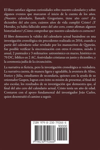El libro satisface algunas curiosidades sobre nuestro calendario y sobre algunos eventos que marcaron el inicio de la cuenta de los años. ¿Nuestro calendario, llamado Gregoriano, tiene año cero? ¿En diciembre del año cero, cuántos años de vida cumplió Cristo? ¿Y Herodes, ya había fallecido antes del año cero, como afirman algunos historiadores? ¿Cómo comprobar que nuestro calendario es correcto? El libro demuestra la validez del calendario actual basándose en una investigación cronológica sin precedentes realizada en 2016, cuando a partir del calendario solar revelado por los manuscritos de Qumrán, fue posible verificar la sincronización con otros 6 eventos, siendo 1 anual, 2 puntuales y 3 milenarios: astronómico en marzo, histórico en 70 DC, bíblico en 2 AC, festividades cristianas en junio y diciembre, y la ceremonia judía de la circuncisión. La narrativa es ficticia, pero la investigación cronológica es verdadera. La narrativa cuenta, de manera ligera y agradable, la aventura de Aline, Enrico y Júlia, estudiantes de secundaria, quienes con la ayuda de su orientador Gaspen, logran con éxito su misión de presentar, al final del año escolar, los resultados de su investigación que demuestra que, al final del año cero del calendario actual, Cristo tenía un año de edad. Contaron con el apoyo fundamental del investigador João Carlos, quien desentrañó el camino a seguir.