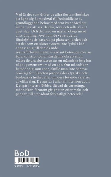 Vad är det som driver de allra flesta människor att ägna sig åt maximal tillfredsställelse av grundläggande behov med stor iver? Med det menar jag att äta, dricka, sova och odla av sitt eget slag. Och det med en nästan obegränsad ansträngning. Även om de vet att deras försörjning är baserad på planeten jorden och att det som ett slutet system inte fysiskt kan anpassa sig till den ökande resursförbrukningen, är sådant beteende mer än bara konstigt. Bara från denna observation måste de dra slutsatsen att en människa inte har något gemensamt med en apa. Om människor betedde sig som apor, skulle man inte behöva oroa sig för planeten jorden i dess fysiska och biologiska helhet eller om dess levande varelser av olika slag. De agerar i alla fall inte som apor. Det går inte att förbise. Så vad driver många människor, förutom girigheten efter makt och pengar, till ett sådant förkastligt beteende?