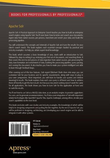Build anenterprise search engine using Apache Solr: index and search documents; ingestdata from varied sources; apply various text processing techniques; utilizedifferent search capabilities; and customize Solr to retrieve the desiredresults. Apache Solr: APractical Approach to Enterprise Search explains each essentialconcept-backed by practical and industry examples--to help you attainexpert-level knowledge.