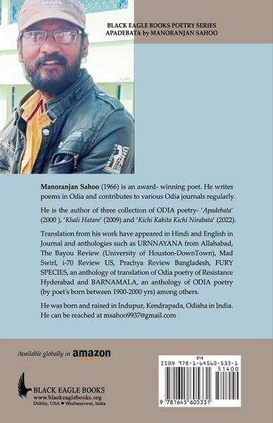 Manoranjan Sahoo born, 10th July 1966, writes poetry from 1985 mostly in Odia. He lives in village named Indupur, Kendrapara, Odisha, near the river Birupa a few kilometer from Budhist Monument Ancient Cultural and Educational University 'Ratnagiri'. His first poetry collection "Apadevata" got published in 2000, Pine Books, Cuttack. The 2nd one "Khali Hatare" in 2009, Ezy's Publication, Bhubaneswar, "Kichhi Kabita Kichhi Nirabata" in 2022, Black Eagle Books, USA. He is the recipient of the "Punnarnava Modern Poetry Award" (2017), "Rajashree Kala O Sahitya Award" (2018), "Sanibara Srujani Sandhya, VaniVihar" (1989), "Aparna Sahitya Sansada Poetry Award" (1996). Best poetry award from "Adeita Smruti Committee" (1999), "Sambad Sahitya Ghara Sammana" (2023), Derabishi, "Barunei Sahitya Sammana" (2023), Rajnagar. Some poetry translated from Odia into other Indian Languages. He can be reached at msahoo9937@gmail.com